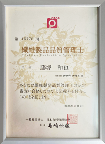 繊維製品品質管理士(TES)は、繊維・洗浄・染色・衣類構造・品質管理などクリーニングと衣類の専門分野を総合的に学んだ「衣類品質の専門家」に与えられる資格です。